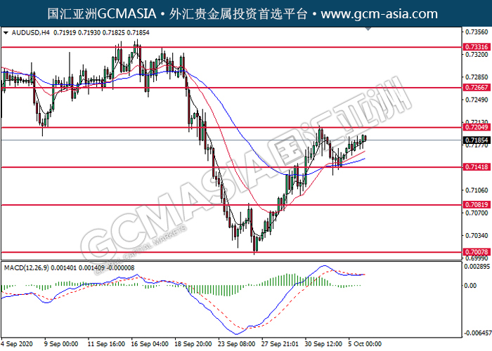 20201006 AUDUSD-午间 by keyk | Oct 6, 2020 | 澳元兑美元 | 0 comments GCMAsia - AUDUSD AUDUSD 2020-10-06 AUDUSD,H4:澳美震荡上行。MACD显示多头信号,短期可继续看多为主。上方关注0.7205压力和0.7265压力,下方关注0.7140支撑和0.7080支撑。