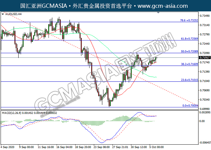 20201006 AUDUSD by willy | Oct 6, 2020 | 澳元兑美元 | 0 comments GCMASIA-AUDUSD AUDUSD 2020-10-06 AUDUSD,H4:澳美低位反弹。MACD空头动能略减,短期可关注多头为主。上方关注0.7210压力和0.7255压力,下方关注0.7160支撑和0.7100支撑。
