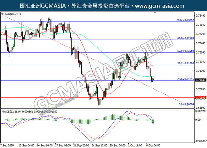 AUDUSD,H4:澳美高位回落,目前测试前期支撑。MACD空头动能略增,若下破可关注空头为主。上方关注0.7160压力和0.7210压力,下方关注0.7035支撑和0.7100支撑。