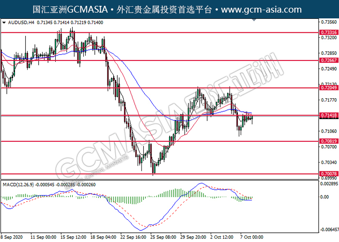 AUDUSD,H4:澳美低位反弹,目前测试着压力位。MACD显示多头信号,动能略增,短期可继续关注多头为主。上方关注0.7140压力和0.7205压力,下方关注0.7080支撑和0.7010支撑。