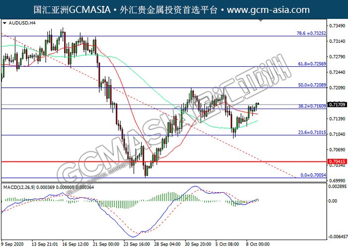 20201009 AUDUSD by willy | Oct 9, 2020 | 澳元兑美元 | 0 comments GCMAsia-AUDUSD AUDUSD 2020-10-09 AUDUSD,H4:澳美突破前期压力,震荡上行。MACD多头动能略增,短期可关注多头为主。上方关注0.7210压力和0.7255压力,下方关注0.7160支撑和0.7100支撑。