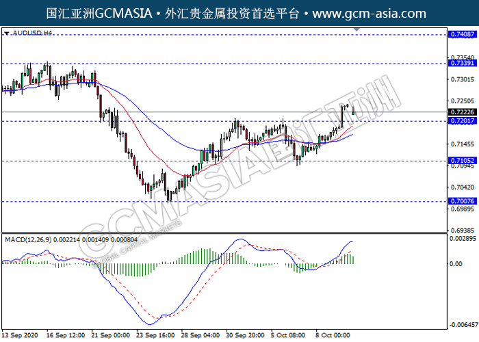 AUDUSD,H4:澳美突破前期压力,多头排列。然而,MACD多头动能有所略减,短期关注技术性空头回调趋势为主。上方关注0.7340压力和0. 7410压力,下方关注0. 7200支撑和0. 7105支撑。