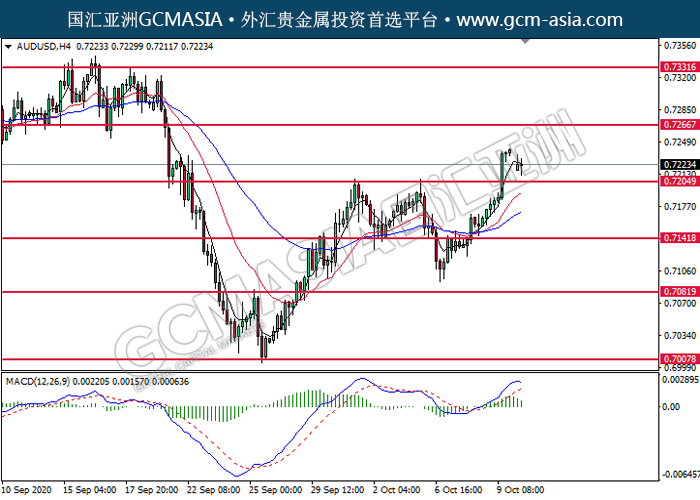 AUDUSD,H4:澳美高位承压后回落。MACD显示空头信号,动能略减,短期可继续关注空头为主。上方关注0.7265压力和0.7330压力,下方关注0.7205支撑和0.7140支撑。