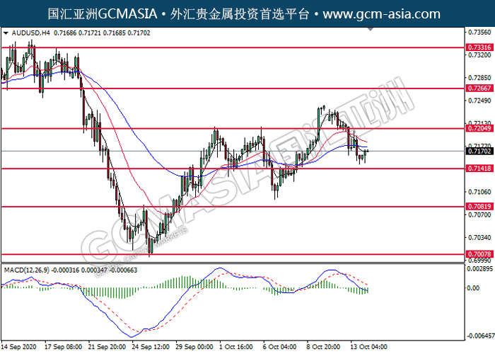 AUDUSD,H4:澳美低位反弹。MACD显示多头信号,动能略增,短期可关注多头反弹为主。上方关注0.7205压力和0.7265压力,下方关注0.7140支撑和0.7080支撑。