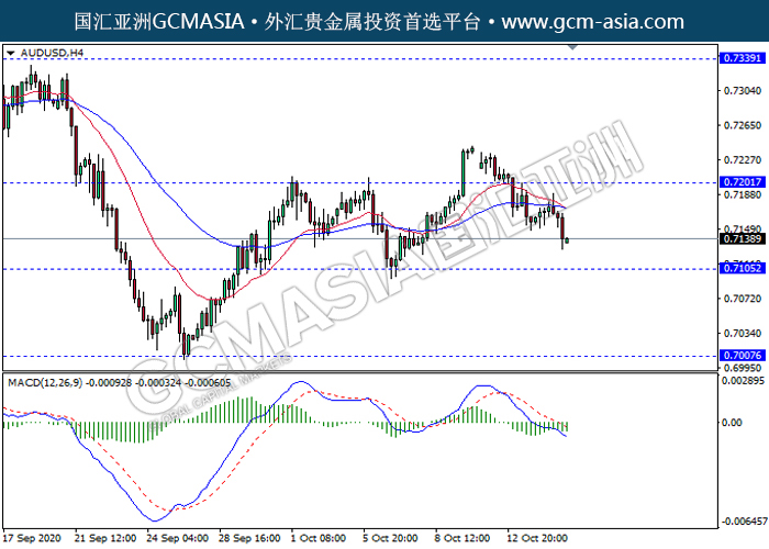 20201015 AUDUSD by keyk | Oct 15, 2020 | 澳元兑美元 | 0 comments GCMAsia - AUDUSD AUDUSD 2020-10-15 AUDUSD,H4:澳美高位承压回落。MACD动能持续略减,短期继续看空为主。上方关注0.7200压力和0.7340压力,下方关注0. 7105支撑和0. 7005支撑。