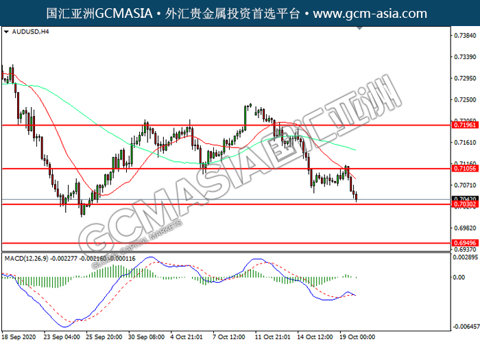 AUDUSD,H4:澳美震荡下行,目前测试前期支撑。MACD已形成死叉,动能转弱,若下破可关注空头为主。上方关注0.7105压力和0.7195压力,下方关注0.7030支撑和0.6950支撑。