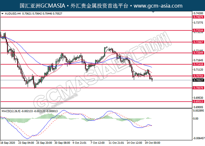 20201020 AUDUSD by willy | Oct 20, 2020 | 澳元兑美元 | 0 comments GCMAsia-AUDUSD AUDUSD 2020-10-20 AUDUSD,H4:澳美突破后持续下行。MACD多头动能略减,短期可关注空头为主。上方关注0.7075压力和0.7140压力,下方关注0.7010支撑和0.6930支撑。