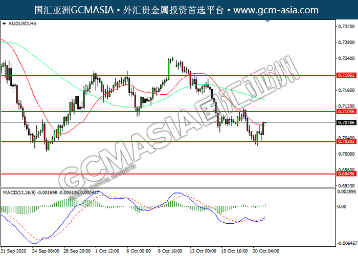20201021 AUDUSD-午间 by keyk | Oct 21, 2020 | 澳元兑美元 | 0 comments GCMAsia - AUDUSD AUDUSD 2020-10-21 AUDUSD,H4:澳美低位反弹。MACD多头动能略增,短期可关注多头为主。上方关注0.7105压力和0.7195压力,下方关注0.7030支撑和0.6950支撑。