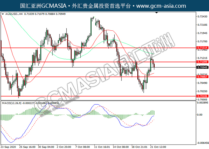 20201022 AUDUSD-午间 by keyk | Oct 22, 2020 | 澳元兑美元 | 0 comments GCMAsia - AUDUSD AUDUSD 2020-10-22 AUDUSD,H4:澳美高位回落。MACD多头动能略减,短期可关注空头为主。上方关注0.7110压力和0.7150压力,下方关注0.7065支撑和0.7010支撑。