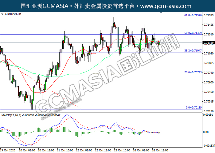20201027 AUDUSD by willy | Oct 27, 2020 | 澳元兑美元 | 0 comments GCMAsia-AUDUSD AUDUSD 2020-10-27 AUDUSD,H1:澳美高位回落。MACD空头动能略增,短期可关注空头为主。上方关注0.7130压力和0.7155压力,下方关注0.7105支撑和0.7075支撑。