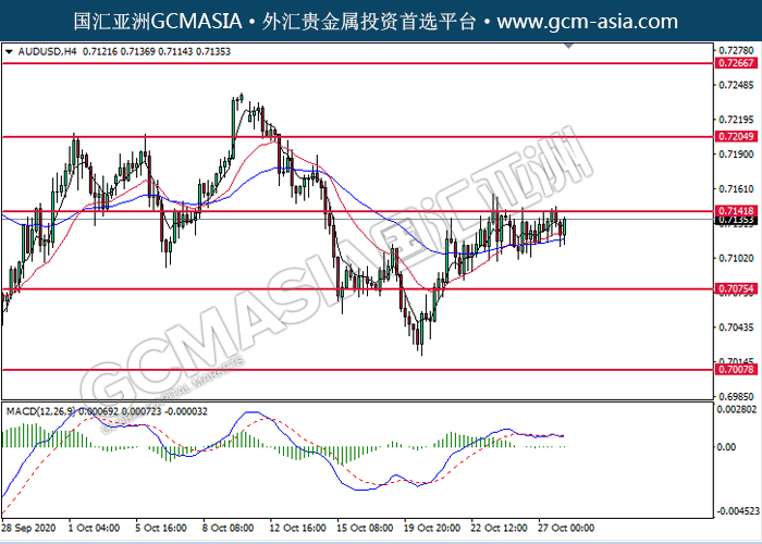 AUDUSD,H4:澳美震荡上行,目前测试着压力位附近。由于MACD并没有显示任何信号,建议等到更多信号出现后才进入市场。上方关注0.7140压力和0.7205压力,下方关注0.7075支撑和0.7010支撑。