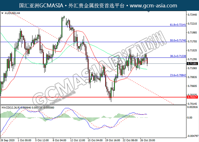 20201028 AUDUSD by willy | Oct 28, 2020 | 澳元兑美元 | 0 comments GCMAsia-AUDUSD AUDUSD 2020-10-28 AUDUSD,H4:澳美高位回落。MACD空头动能略增,短期可关注空头为主。上方关注0.7135压力和0.7175压力,下方关注0.7085支撑和0.7030支撑。