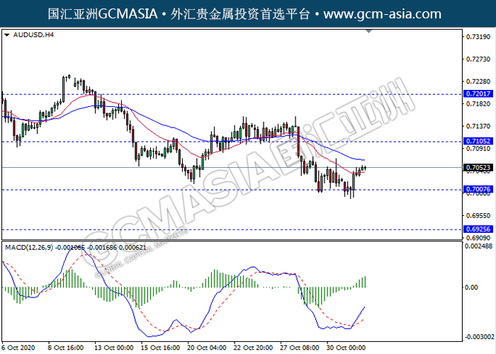 20201103 AUDUSD by keyk | Nov 3, 2020 | 澳元兑美元 | 0 comments GCMAsia - AUDUSD AUDUSD 2020-11-03 AUDUSD,H4:澳美触底反弹上行。MACD形成金叉,动能略增,短期继续关注多头反弹为主。上方关注0.7105压力和0.7200压力,下方关注0.7005支撑和0.6925支撑。