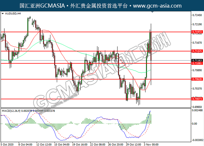 AUDUSD,H4:澳美高位回落,目前靠近前期支撑。MACD多头动能略减,若下破可关注空头为主。上方关注0.7145压力和0.7195压力,下方关注0.7110支撑和0.7065支撑。