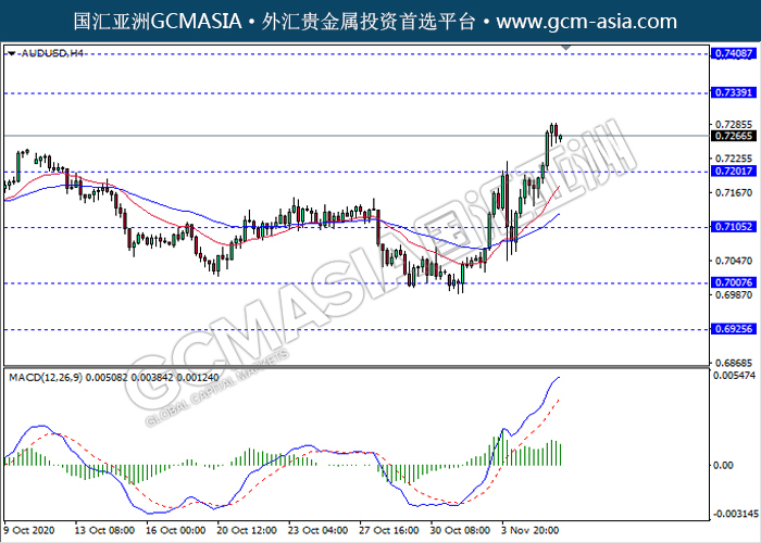AUDUSD,H4:澳美突破前期压力,多头排列。然而,MACD多头动能有所略减,短期关注技术性空头回调为主。上方关注0.7340压力和0.7410压力,下方关注0.7200支撑和0.7105支撑。
