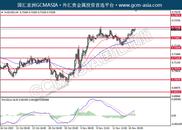 20201117 AUDUSD-午间 by keyk | Nov 17, 2020 | 澳元兑美元 | 0 comments AUDUSD,H4:澳美突破后持续上行,目前测试着压力位。MACD动能略增,若突破可持续关注多头走势为主。上方关注0.7330压力和0.7405压力,下方关注0.7265支撑和0.7205支撑。