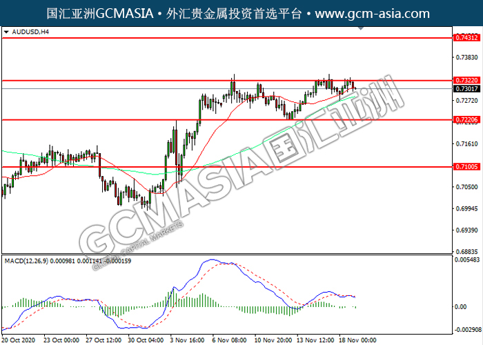 AUDUSD,H4:澳美震荡盘整,目前测试前期压力。然而,MACD已形成死叉,动能转弱,短期可关注空头为主。上方关注0.7320压力和0.7430压力,下方关注0.7220支撑和0.7100支撑。