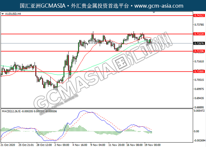 AUDUSD,H4:澳美震荡下行。MACD空头动能转增,短期可关注空头为主。上方关注0.7320压力和0.7430压力,下方关注0.7220支撑和0.7100支撑。