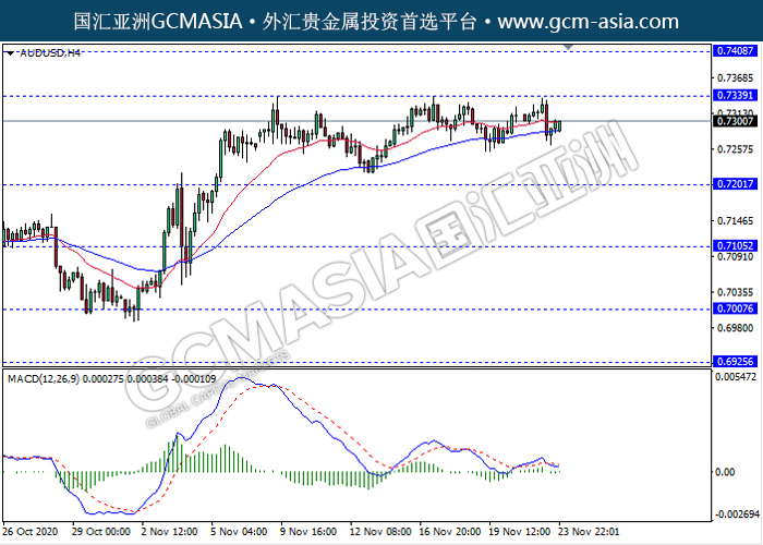 20201124 AUDUSD by keyk | Nov 24, 2020 | 澳元兑美元 | 0 comments GCMAsia - AUDUSD AUDUSD 2020-11-24 AUDUSD,H4:澳美近期高位承压回落。MACD显示空头,动能略减,短期继续看空回调为主。上方关注0.7340压力和0.7410压力,下方关注0.7200支撑和0.7105支撑。