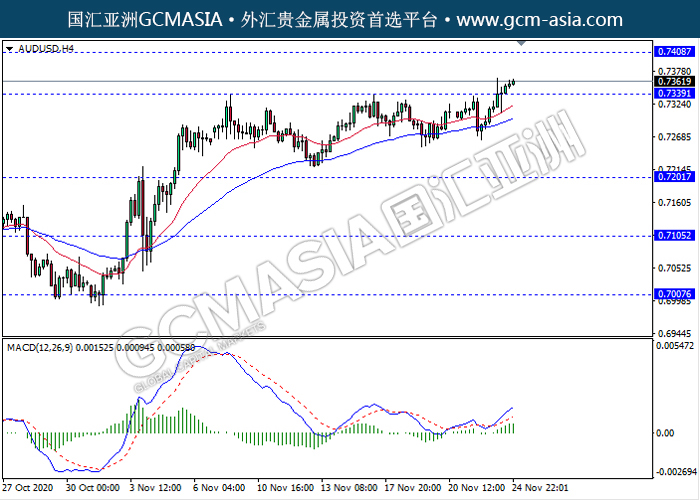 20201125 AUDUSD by keyk | Nov 25, 2020 | 澳元兑美元 | 0 comments GCMAsia - AUDUSD AUDUSD 2020-11-25 AUDUSD,H4:澳美突破前期压力,多头排列。MACD动能持续略增,中期继续看多为主。上方关注0.7410压力和0.7480压力,下方关注0.7340支撑和0.7200支撑。