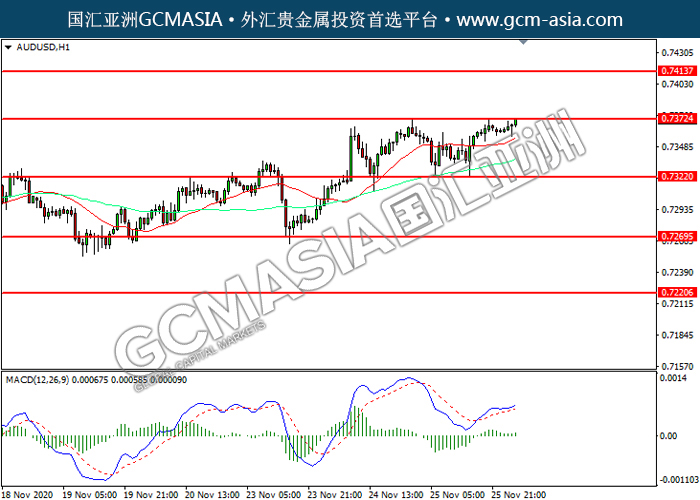 AUDUSD,H1:澳美震荡上行,目前测试前期压力。MACD多头动能略增,若突破可关注多头为主。上方关注0.7370压力和0.7415压力,下方关注0.7320支撑和0.7270支撑。