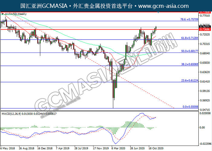 AUDUSD,Weekly:澳美近期突破前期压力,震荡上行。MACD已形成金叉,动能转强,短期可关注多头为主。上方关注0.7570压力和0.7780压力,下方关注0.7370支撑和0.7130支撑。