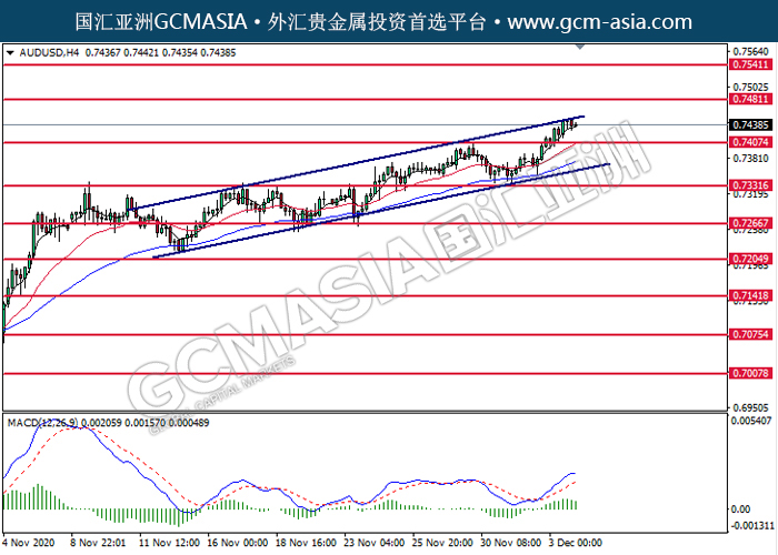 AUDUSD,H4:澳美震荡上行,目前测试着上身通道顶部。然而,MACD多头动能转弱,短期可关注空头为主。上方关注0.7480压力和0.7540压力,下方关注0.7405支撑和0.7330支撑。
