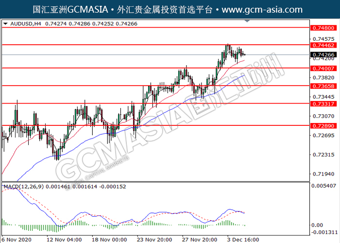 20201207 AUDUSD by willy | Dec 7, 2020 | 澳元兑美元 | 0 comments GCMAsia-AUDUSD AUDUSD 2020-12-07 AUDUSD,H4:澳美高位承压后回落。MACD动能略减,短期可关注空头走势为主。上方关注0.7445压力和0.7480压力,下方关注0.7400支撑和0.7365支撑。