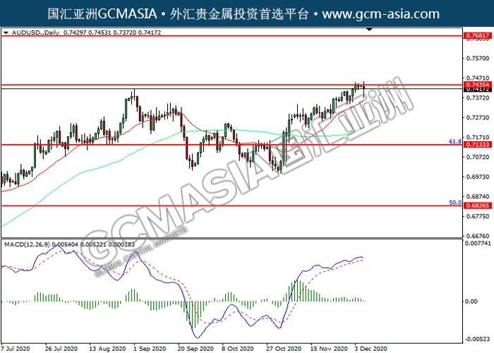 AUDUSD,Daily:澳美震荡上行,目前测试前期压力。然而,MACD多头动能略减,短期可关注技术性回调为主。上方关注0.7435压力和0.7680压力,下方关注0.7135支撑和0.6825支撑。