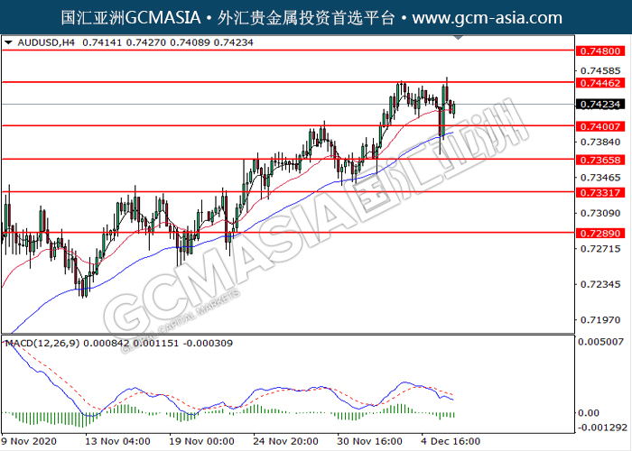 20201208 AUDUSD-午间 by keyk | Dec 8, 2020 | 澳元兑美元 | 0 comments GCMAsia-AUDUSD AUDUSD 2020-12-08 AUDUSD,H4:澳美高位承压后回落。MACD动能略减,短期可关注空头走势为主。上方关注0.7445压力和0.7480压力,下方关注0.7400支撑和0.7365支撑。