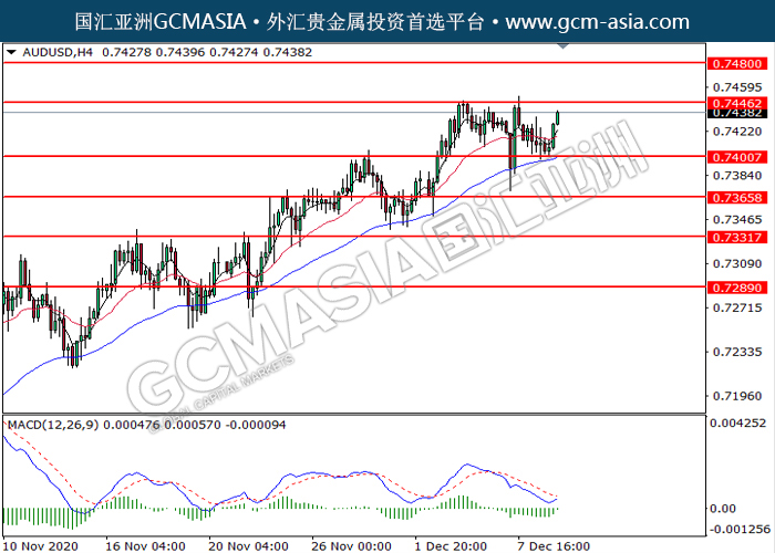 20201209 AUDUSD-午间 by keyk | Dec 9, 2020 | 澳元兑美元 | 0 comments GCMAsia-AUDUSD AUDUSD 2020-12-09 AUDUSD,H4:澳美低位反弹。MACD动能略增,短期可关注多头走势为主。上方关注0.7445压力和0.7480压力,下方关注0.7400支撑和0.7365支撑。