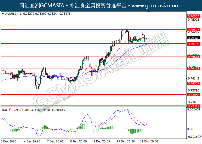 AUDUSD,H1:澳美低位反弹。MACD动能略增,短期可关注多头走势为主。上方关注0.7565压力和0.7605压力,下方关注0.7520支撑和0.7480支撑。