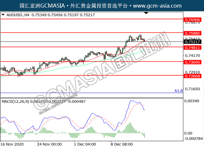 20201215 AUDUSD-午间 by willy | Dec 15, 2020 | 澳元兑美元 | 0 comments GCMAsia-AUDUSD AUDUSD 2020-12-15 AUDUSD,H4:澳美高位回落。MACD空头动能略增,短期可关注空头走势为主。上方关注0.7590压力和0.7690压力,下方关注0.7480支撑和0.7370支撑。
