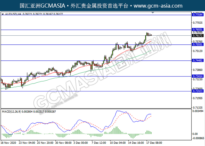 AUDUSD,H4:澳美多头排列,目前测试靠近前期压力。然而,MACD显示空头信号,多头动能略减,短期关注技术性空头回调趋势为主。上方关注0.7655压力和0.7755压力,下方关注0.7555支撑和0.7450支撑。