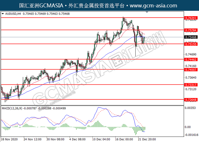 20201223 AUDUSD by willy | Dec 23, 2020 | 澳元兑美元 | 0 comments GCMAsia-AUDUSD AUDUSD 2020-12-23 AUDUSD,H4:澳美低位反弹。MACD空头动能转弱,短期可关注多头走势为主。上方关注0.7580压力和0.7635压力,下方关注0.7515支撑和0.7445支撑。