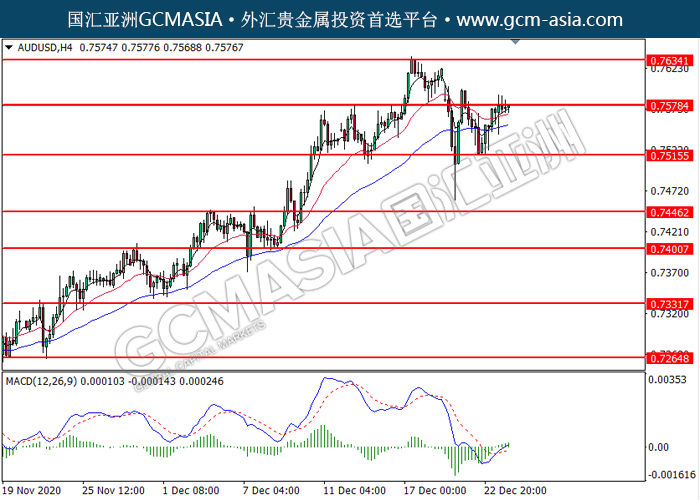 AUDUSD,H4:澳美低位反弹,目前测试着压力位。MACD多头动能转强,若突破可关注多头走势为主。上方关注0.7580压力和0.7635压力,下方关注0.7515支撑和0.7445支撑。