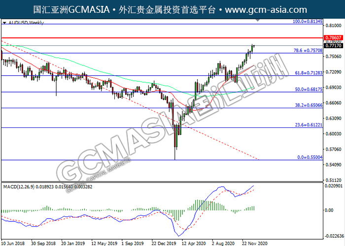 AUDUSD,Weekly:澳美突破前期压力,震荡上行。MACD多头动能略增,短期可关注多头走势为主。上方关注0.7860压力和0.8135压力,下方关注0.7570支撑和0.7130支撑。