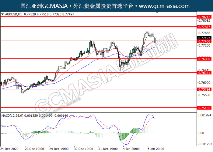 AUDUSD,H1:澳美高位承压后回落,目前测试着支撑位。MACD空头动能略增,若突破可关注空头为主。上方关注0.7785压力和0.7820压力,下方关注0.7740支撑和0.7680支撑。