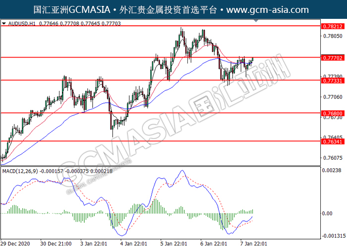 AUDUSD,H1:澳美低位反弹,目前测试着压力位。MACD多头动能略增,若突破可关注多头为主。上方关注0.7770压力和0.7820压力,下方关注0.7735支撑和0.7680支撑。