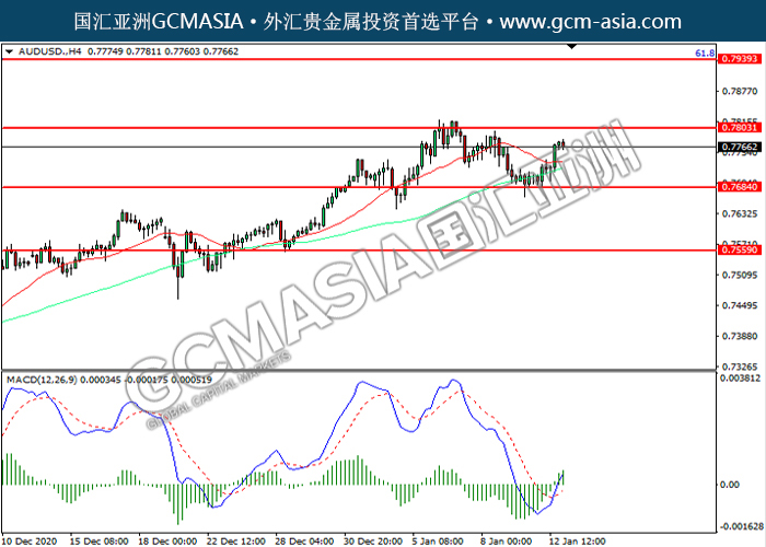 AUDUSD,H4:澳美震荡上行。MACD多头动能略增,短期可关注多头走势为主。上方关注0.7805压力和0.7940压力,下方关注0.7685支撑和0.7560支撑。
