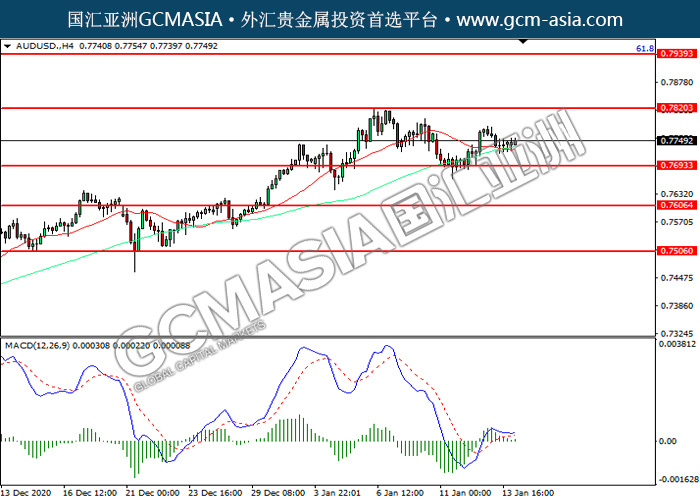 20210114 AUDUSD-午间 by willy | Jan 14, 2021 | 澳元兑美元 | 0 comments GCMAsia-AUDUSD AUDUSD 2021-01-14 AUDUSD,H4:澳美震荡盘整。MACD多头动能略减,短期可关注空头走势为主。上方关注0.7820压力和0.7940压力,下方关注0.7695支撑和0.7605支撑。