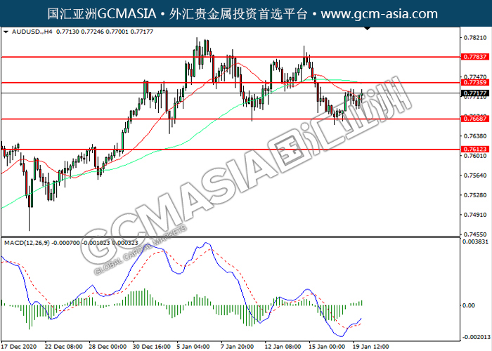 20210120 AUDUSD-午间 by keyk | Jan 20, 2021 | 澳元兑美元 | 0 comments GCMAsia-AUDUSD AUDUSD 2021-01-20 AUDUSD,H4:澳美震荡上行。MACD多头动能持续略增,短期可关注多头为主。上方关注0.7735压力和0.7785压力,下方关注0.7670支撑和0.7610支撑。