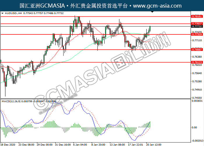 AUDUSD,H4:澳美震荡上行,目前测试前期压力。MACD多头动能持续略增,若突破继续看多为主。上方关注0.7785压力和0.7815压力,下方关注0.7735支撑和0.7670支撑。