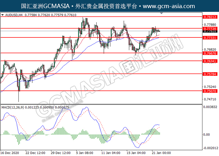 20210122 AUDUSD by willy | Jan 22, 2021 | 澳元兑美元 | 0 comments GCMAsia-AUDUSD AUDUSD 2021-01-22 AUDUSD,H4:澳美高位承压后回落。MACD多头动能略减,短期可关注空头为主。上方关注0.7770压力和0.7820压力,下方关注0.7735支撑和0.7670支撑。