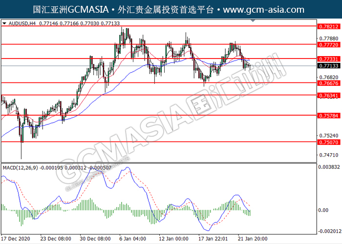 20210125 AUDUSD by willy | Jan 25, 2021 | 澳元兑美元 | 0 comments GCMAsia-AUDUSD AUDUSD 2021-01-25 AUDUSD,H4:澳美突破后持续下行。MACD空头动能偏强,短期可关注空头为主。上方关注0.7735压力和0.7770压力,下方关注0.7670支撑和0.7635支撑。