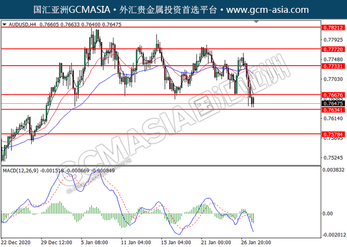 20210128 AUDUSD by willy | Jan 28, 2021 | 澳元兑美元 | 0 comments GCMAsia-AUDUSD AUDUSD 2021-01-28 AUDUSD,H4:澳美突破后持续下行。MACD空头动能略增,短期可关注空头为主。上方关注0.7665压力和0.7735压力,下方关注0.7635支撑和0.7580支撑。