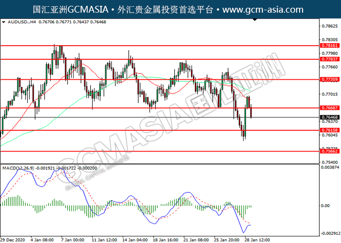 AUDUSD,H4:澳美下破前期支撑,震荡下行。然而,MACD空头动能略减,短期可关注技术性回调为主。上方关注0.7670压力和0.7735压力,下方关注0.7615支撑和0.7565支撑。