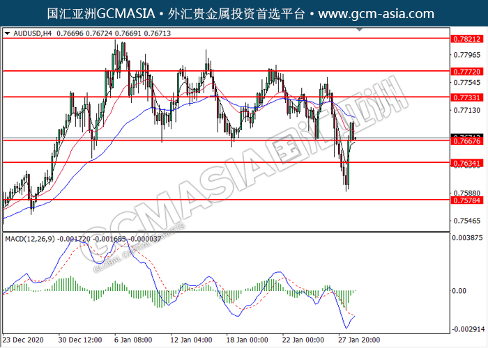 20210129 AUDUSD by willy | Jan 29, 2021 | 澳元兑美元 | 0 comments GCMAsia-AUDUSD AUDUSD 2021-01-29 AUDUSD,H4:澳美突破后持续上行。MACD空头动能略减,短期可关注多头为主。上方关注0.7735压力和0.7770压力,下方关注0.7665支撑和0.7635支撑。
