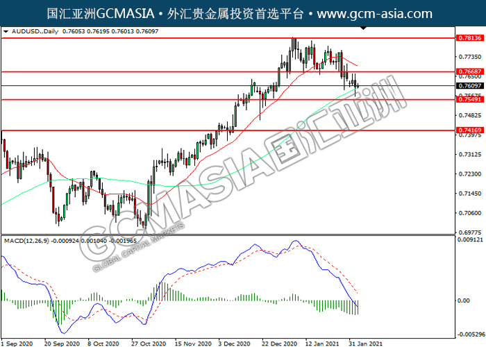 AUDUSD,Daily:澳美下破前期支撑,持续下行。然而,MACD空头动能略减,短期可关注技术性回调为主。上方关注0.7670压力和0.7815压力,下方关注0.7550支撑和0.7415支撑。