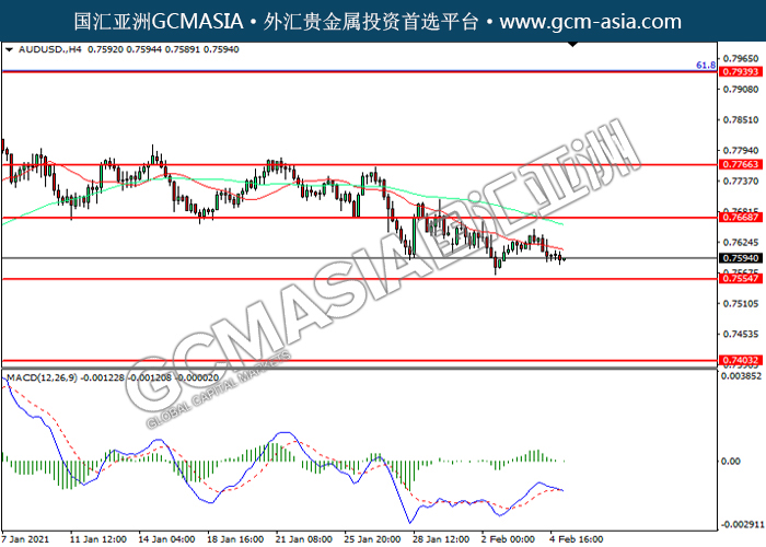 AUDUSD,H4:澳美震荡下行,目前靠近前期支持鞥。MACD多头动能略减少,若下破可关注空头趋势为主。上方关注0.7670压力和0.7765压力,下方关注0.7555支撑和0.7405支撑。